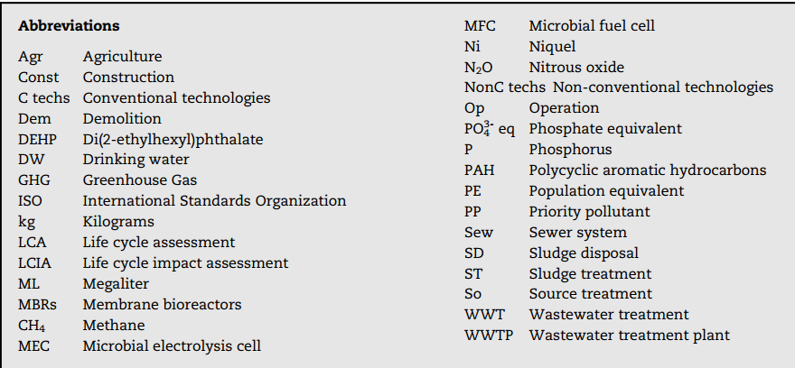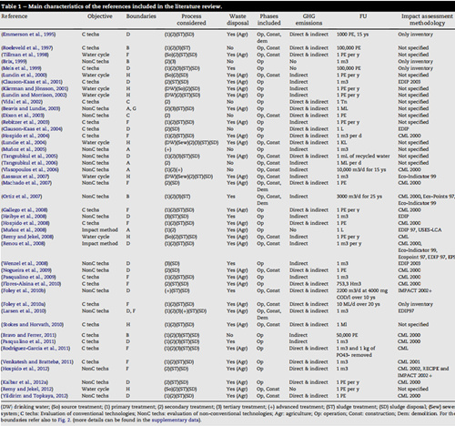 盡管水環(huán)境衛(wèi)生可以追溯到兩河流域時代(Lofrano and Brown, 2010),但是當(dāng)前運用的活性污泥工藝直到1913年才在英國被第一次提出(Lofrano and Brown, 2010)。在二十世紀(jì),水環(huán)境衛(wèi)生系統(tǒng)使大量的人口免于疾病的侵?jǐn)_。然而,社會并沒有意識到存在著和水環(huán)境衛(wèi)生聯(lián)系的其他環(huán)境代價。在世界環(huán)境與發(fā)展委員會定義了可持續(xù)發(fā)展策略后(WCED, 1987),一些污水處理從業(yè)人員和研究者開始采用LCA對污水處理過程對環(huán)境造成的影響來進(jìn)行評價。LCA的演化史可以通過參考文獻(xiàn)中的論文和已被評價的不同的目標(biāo)來了解。表格1列出了本次綜述的所有文獻(xiàn)以及它們的主要特點。