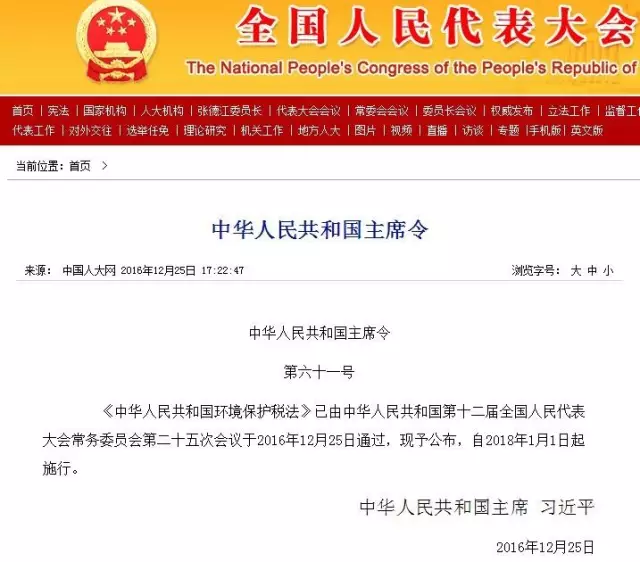 12月25日,習(xí)近平簽發(fā)中華人民共和國第六十一號主席令:《中華人民共和國環(huán)境保護(hù)稅法》已由中華人民共和國第十二屆全國人民代表大會常務(wù)委員會第二十五次會議于2016年12月25日通過,現(xiàn)予公布,自2018年1月1日起施行。