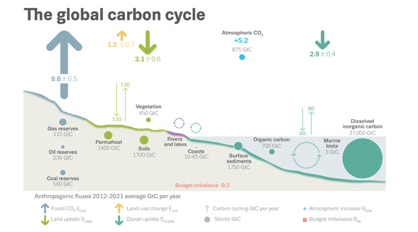 在陸地和海洋碳匯方面,《報(bào)告》數(shù)據(jù)顯示,受到氣候變化的負(fù)面影響,陸地和海洋碳匯分別減少17%、4%,但仍占到碳排放總量的一半左右(過去十年平均為53%)。其中,在2012-2021年期間,陸地碳匯每年平均為114億噸,2022年預(yù)計(jì)為124億噸;海洋碳匯每年平均為105億噸,2022年預(yù)計(jì)為105億噸。