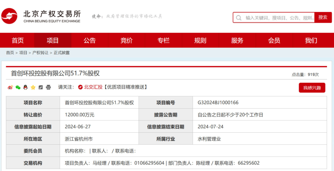 首創(chuàng)股份擬公開(kāi)掛牌轉(zhuǎn)讓首創(chuàng)利池60%股權(quán)
