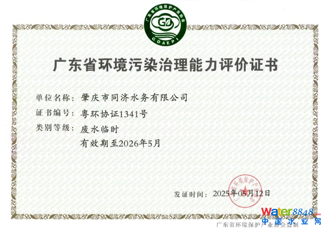 同濟環(huán)境·肇慶市同濟水務有限公司榮獲2025年第一批廣東省環(huán)境污染治理能力評價證書