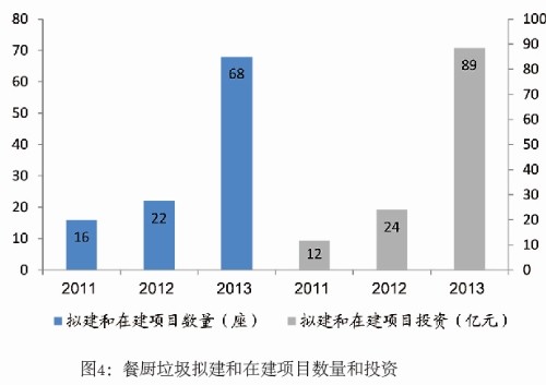 訂單面:13年訂單大量釋放:2013年,據(jù)中國固廢網(wǎng)統(tǒng)計(jì),全國餐廚垃圾總處理能力2.47萬噸/日,單個(gè)項(xiàng)目平均處理能力211噸/日,噸處理建設(shè)投資約55萬元/噸;在建和擬建項(xiàng)目數(shù)量達(dá)到68個(gè),總投資金額達(dá)到88.50億元,較前兩年大幅提升。