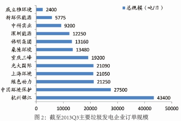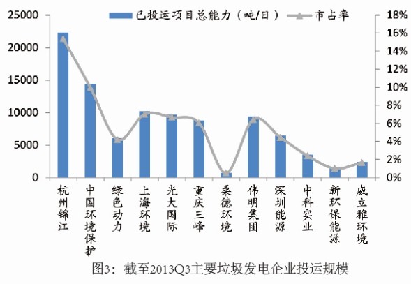 截至2013年三季度末,這12家主要企業(yè)投運(yùn)的垃圾發(fā)電廠87座,投運(yùn)能力9.5萬噸/日;數(shù)量的市場占有率55%、處理能力的市場占有率66%。