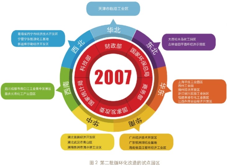 2005年10月,國家發(fā)改委等六部委聯(lián)合發(fā)布了《關于組織開展循環(huán)經(jīng)濟試點(第一批)工作的通知》,標志著我國園區(qū)循環(huán)化改造工作的開端,當時被選入的產(chǎn)業(yè)園區(qū)共有13家,按照數(shù)量依次為華東4家,華北3家,西北和東北各2家,華中和西南各1家,華南零家(圖1)。2007年,又有20家產(chǎn)業(yè)園區(qū)被選入第二批循環(huán)經(jīng)濟試點,這一次的對象以重化工集聚地為主,按照數(shù)量依次為華東6家,西北、華南和華中各3家,西南和東北各2家,華北1家(圖2)。至此,我國工業(yè)園區(qū)循環(huán)化改造的地理格局已經(jīng)大致呈現(xiàn)。