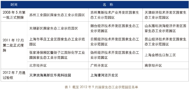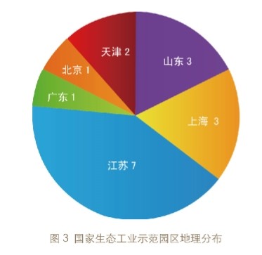 2007年4月,國家環(huán)?偩、商務部和科技部聯(lián)合發(fā)布了《關于開展國家生態(tài)工業(yè)示范園區(qū)建設工作的通知》,標志著我國園區(qū)生態(tài)化改造工作的開端。次年即2008年5月,有3家園區(qū)成為第一批被正式授牌的國家生態(tài)工業(yè)示范園區(qū),2011年12月,第二批12家被正式授牌,2012年7月又有2家通過驗收(表1)。因此迄今為止,我國名符其實的只有這十七家國家生態(tài)工業(yè)示范園區(qū),其中華東地區(qū)占了五分之四強,特別是江蘇一省就占了將近半數(shù)(圖3)。