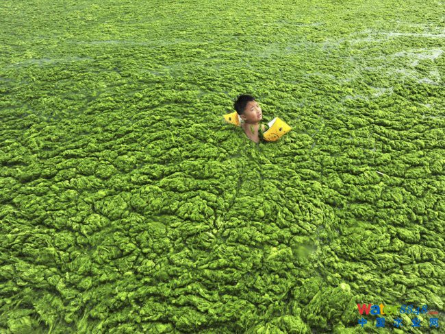 一個男孩在山東省島的一個滿是綠藻的海岸邊上游泳