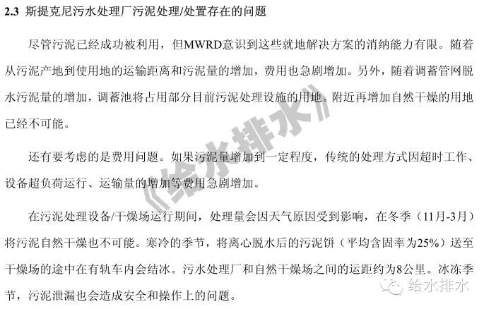 MWRD近期的污泥處理方式主要是厭氧消化、離心分離/濃縮、自然干燥。離心分離和自然干燥均受到氣候條件的限制,尤其是在冬季,因此決定用不受天氣影響的機(jī)械處理方法處理一部分污泥,這樣將會(huì)增加現(xiàn)在有設(shè)施的靈活性,并降低現(xiàn)有處理方式的費(fèi)用,在新的處理廠建成之前,現(xiàn)有處理方式的費(fèi)用還會(huì)有所增加,不受天氣影響的處理技術(shù)還可以減少冬季將污泥從離心設(shè)備運(yùn)送至自然干化床時(shí)遇到的問(wèn)題。