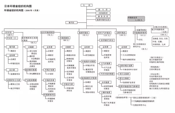 現(xiàn)在,在1971年日本環(huán)境廳設(shè)置之后,2001年,日本環(huán)境省設(shè)置,目前已有工作人員1100多名。下圖是日本環(huán)境省的組織結(jié)構(gòu)圖。