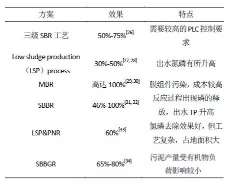 近年來,一些新的工藝不斷涌現(xiàn)(見表3)。左寧等人針對LSP&PNR污泥減量新工藝進(jìn)行了研究:穩(wěn)定運行的LSP&PNR系統(tǒng)的污泥齡越長,污泥濃度越高,污泥負(fù)荷越低,污泥產(chǎn)率也越低。當(dāng)SRT=5d時,相應(yīng)的污泥產(chǎn)率Ys最高,為0.381 kgMLSS/(kgCOD);當(dāng)SRT=50d時,污泥產(chǎn)率僅有0.143 kgMLSS/(kgCOD)。Di Iaconi等對序批式生物濾池顆粒污泥反應(yīng)器(SBBGR)的污泥減量效果進(jìn)行研究,該系統(tǒng)內(nèi)污泥產(chǎn)率僅為0.12-0.14kgTSSCODremoved(生物量為20-45gVSS/L,污泥齡>120天),即使有機負(fù)荷由1.0 kgCOD/m3d提高到2.5kgCOD/m3d過程中,對污泥產(chǎn)率也并未造成大的影響。