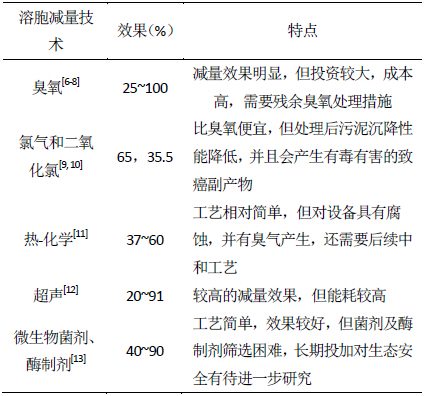 溶胞-隱性生長是通過物理、化學(xué)及生物方法將細(xì)胞壁和細(xì)胞膜破壞,釋放出胞內(nèi)物質(zhì)作為微生物代謝的底物,進(jìn)而實現(xiàn)污泥總體表觀產(chǎn)率降低,污泥產(chǎn)量減少。該技術(shù)關(guān)鍵的步驟是微生物溶胞處理技術(shù)。目前常用的溶胞污泥減量技術(shù)的效果及特點歸納起來見表1。
