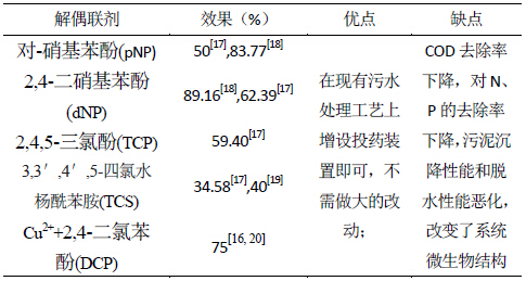表2 化學(xué)解偶聯(lián)劑減少污泥產(chǎn)量的效果及技術(shù)特點