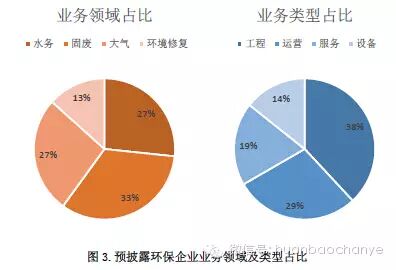 從披露企業(yè)的業(yè)務(wù)領(lǐng)域來看固廢領(lǐng)域所占份額最高,水務(wù)次之。而至于企業(yè)的業(yè)務(wù)類型,從事環(huán)保工程的企業(yè)份額最大,其次為環(huán)保設(shè)施的運(yùn)營(yíng)。