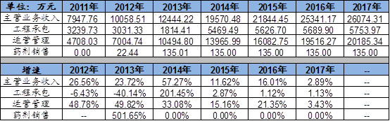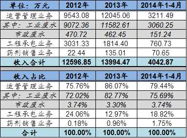 海拓環(huán)境主營(yíng)業(yè)務(wù)具體包括污水處理的運(yùn)營(yíng)管理業(yè)務(wù)、工程承包業(yè)務(wù)以及藥劑銷售業(yè)務(wù)。其中環(huán)境運(yùn)營(yíng)管理業(yè)務(wù)是公司主要的收入和利潤(rùn)來(lái)源。