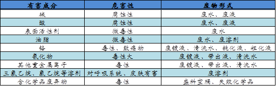 • 含鉻廢水:包括鍍鉻、鍍黑鉻、表面鈍化、退鍍以及塑料電鍍前處理粗化等工序產(chǎn)生的廢水。主要污染物為六價(jià)鉻、總鉻等。毒性大,須單獨(dú)收集、處理。