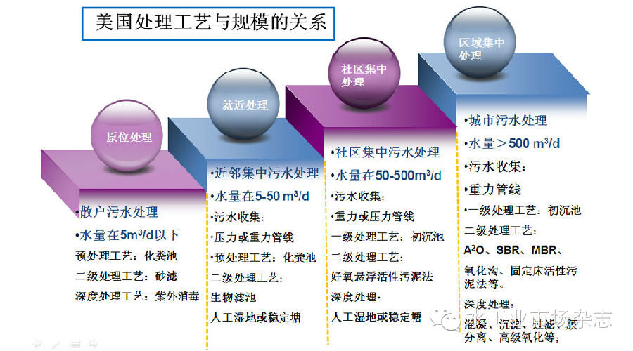 依據(jù)規(guī)模、水質(zhì)要求、投資成本、運行成本、占地、管理難易等因素,合理選擇處理工藝。一般城市污水則是以進出水水質(zhì)為考慮因素,而農(nóng)村污水規(guī)模是最重要的工藝選擇標(biāo)準(zhǔn),也就是說量的大小對工藝的影響是最大的。美國處理工藝與規(guī)模的關(guān)系(見圖2)比較明確,基本上是根據(jù)規(guī)模來進行選擇的。日本基本也是根據(jù)規(guī)模進行選擇,按照規(guī)模由大到小來采用不同的污水處理方法。而審視我國對凈化槽的應(yīng)用,通常把凈化槽用在很大的村莊,其應(yīng)用是否錯位?實際上凈化槽是用在三家五戶就近和原位處理系統(tǒng)中的。