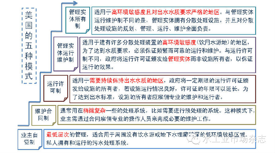 應(yīng)研究明確建設(shè)管理模式,明確市、縣、鎮(zhèn)以及行政村各級政府或組織在規(guī)劃、投資、建設(shè)、運營、監(jiān)管等各環(huán)節(jié)的責(zé)任。美國的五種建設(shè)管理模式(見圖3),按照水質(zhì)的要求、工藝的不同,建立不同的管理模式。