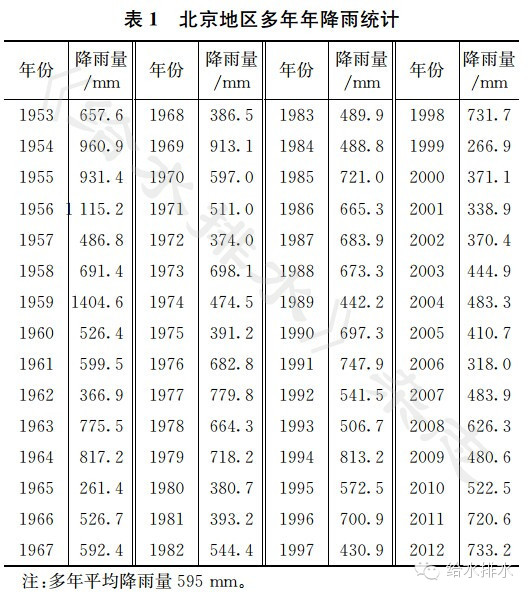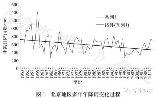 結(jié)合北京市實(shí)情,本“規(guī)范”中降雨參數(shù)的確定選取了氣象部門(mén)的數(shù)據(jù),根據(jù)中國(guó)氣象局官網(wǎng)提供的北京觀象臺(tái)站降雨量數(shù)據(jù),由此確定北京地區(qū)(以北京觀象臺(tái)站為例)1953年~2012年多年平均降雨量為595mm,北京降雨呈現(xiàn)趨勢(shì)北京地區(qū)降雨統(tǒng)計(jì)見(jiàn)表1,年降雨量總體呈下降趨勢(shì),見(jiàn)圖1。1.2 北京地區(qū)典型降雨量