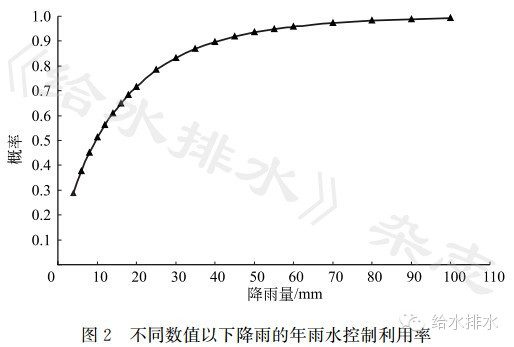采取多年降雨資料統(tǒng)計(jì)數(shù)據(jù),分析得到年雨水控制利用率所對(duì)應(yīng)的設(shè)計(jì)降雨量(日降雨值),設(shè)計(jì)雨量的確定通過(guò)統(tǒng)計(jì)學(xué)方法獲得,將多年的降雨量日值按雨量大小分類(lèi),統(tǒng)計(jì)小于某一降雨量的降雨總量在總降雨量中的比例。