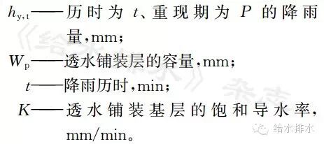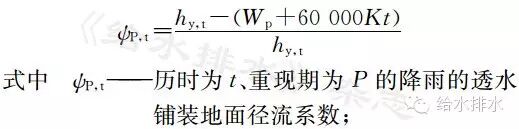 透水鋪裝地面徑流系數(shù)的取值,對(duì)于一定結(jié)構(gòu)的透水鋪裝地面,當(dāng)降雨量超過(guò)透水鋪裝層容量和路基層土壤下滲能力時(shí)將產(chǎn)生徑流,根據(jù)原北京市地方標(biāo)準(zhǔn)《城市雨水利用工程技術(shù)規(guī)程》,其徑流系數(shù)的理論值可按照公式(2-1)計(jì)算。