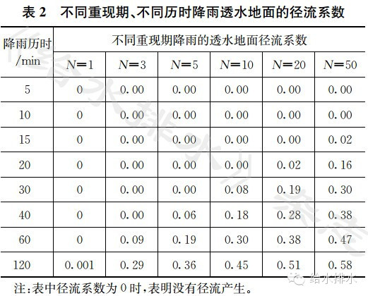 從表2中可以看出,透水鋪裝地面的徑流系數(shù)隨降雨重現(xiàn)期增大、降雨歷時(shí)增加而增大,表現(xiàn)為:降雨重現(xiàn)期越大,雨水下滲量占降雨量的比例越小,透水鋪裝地面徑流系數(shù)越大;降雨歷時(shí)越長(zhǎng),透水鋪裝地表徑流系數(shù)越大。