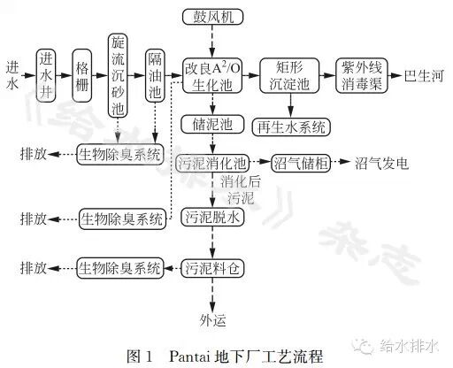 Pantai第二污水處理廠主體工藝采用旋流沉砂池+改良A2O+矩形沉淀池+紫外消毒,污泥進行厭氧消化,水廠臭氣進入生物濾池進行脫臭處理,整套工藝流程簡單,運行穩(wěn)定,管理方便,在技術和經濟上都具有優(yōu)勢。Pantai地下廠主要工藝流程如圖1所示。