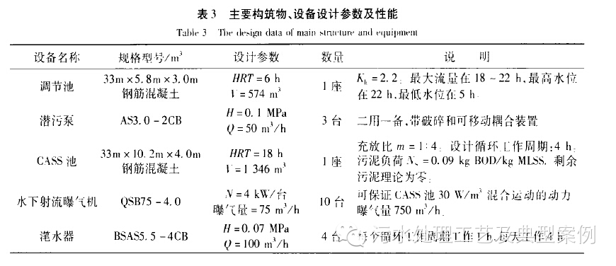 處于缺氧一好氧一厭氧交替運(yùn)行的過程,因此具有較好的脫氮除磷效果。主要設(shè)汁參數(shù)的計(jì)算見表2,主要構(gòu)筑物、設(shè)備設(shè)計(jì)參數(shù)及性能見表3: