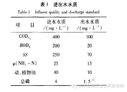 處理污水量:近期Qh=1 600/24=67 m 3/h,遠(yuǎn)期Qh=2 400/24=100 m3/h.設(shè)備處理能力按近期設(shè)計(jì),能適應(yīng)遠(yuǎn)期的要求。處理的污水為生活污水,經(jīng)處理后出水水質(zhì)達(dá)《污水綜合排放標(biāo)準(zhǔn)》GB8978—1996一級(jí)排放標(biāo)準(zhǔn)。進(jìn)、出水的水質(zhì)見表1。