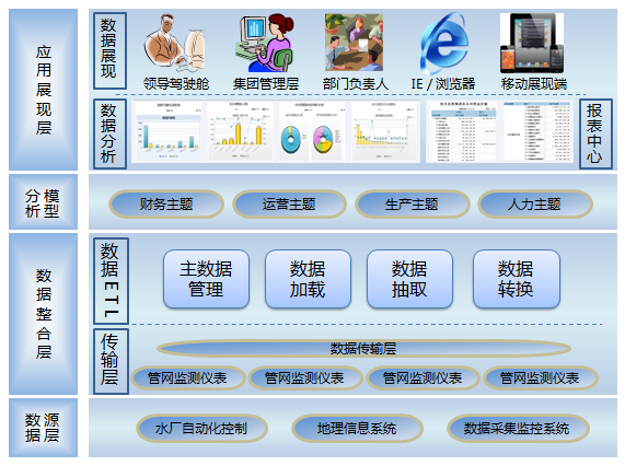 近年來,清源華衍水務(wù)集團的信息化建設(shè)卓有成效,在國內(nèi)處于較領(lǐng)先水平,但與國際先進水平相比仍存在差距。加快企業(yè)信息化建設(shè),解決信息化高速路上出現(xiàn)的信息孤島,成為華衍水務(wù)的首要任務(wù),因此,規(guī)劃一個集團型的商業(yè)分析平臺,匯集企業(yè)經(jīng)營數(shù)據(jù),統(tǒng)一管理企業(yè)信息化系統(tǒng),實現(xiàn)財務(wù)的透明化管理,業(yè)務(wù)的績效監(jiān)督和激勵,進一步達到各部門數(shù)據(jù)共享、業(yè)務(wù)流程自動化、信息化平臺搭建及標(biāo)準(zhǔn)規(guī)范的健全。