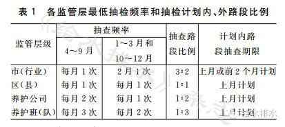 對排水設(shè)施檢測所采用的儀器設(shè)備主要有電視、聲納、管道窺視鏡等,同時(shí)也進(jìn)行常規(guī)檢查(量泥斗測量)。養(yǎng)護(hù)公司、養(yǎng)護(hù)班(隊(duì))兩級監(jiān)管層級根據(jù)自身情況進(jìn)行檢測,檢測儀器和方法不受限制。檢查監(jiān)管抽檢頻率如表1所示。