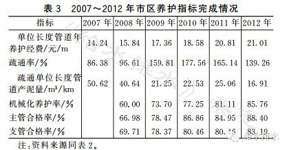 為了更好地反映排水管道養(yǎng)護(hù)情況,上海市排水管理處確立了養(yǎng)護(hù)經(jīng)費(fèi)投入、疏通率、疏通單位長度管道產(chǎn)泥量、單位長度管道產(chǎn)泥量等養(yǎng)護(hù)指標(biāo),20072012年上海市市區(qū)養(yǎng)護(hù)指標(biāo)對照見3。