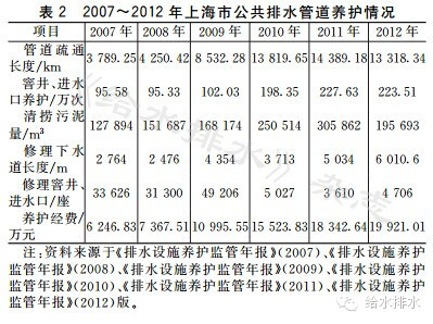 通過匯總排水管道設(shè)施養(yǎng)護(hù)市場化改革第三階段以來上海市各區(qū)縣排水管道設(shè)施歷年來的養(yǎng)護(hù)統(tǒng)計(jì)數(shù)據(jù),可以清楚地發(fā)現(xiàn)各項(xiàng)指標(biāo)均有了不同程度地提高,如養(yǎng)護(hù)工作量、污泥產(chǎn)量等都有大幅度增長,養(yǎng)護(hù)合格率和經(jīng)費(fèi)投入都呈現(xiàn)出上升趨勢,同時(shí),因管道養(yǎng)護(hù)問題造成和加劇道路積水的情況明顯得到了改善,城市道路積水時(shí)間大幅減少,極大地改善了上海的城市形象。20072012年上海市公共排水管道養(yǎng)護(hù)業(yè)績見表2。