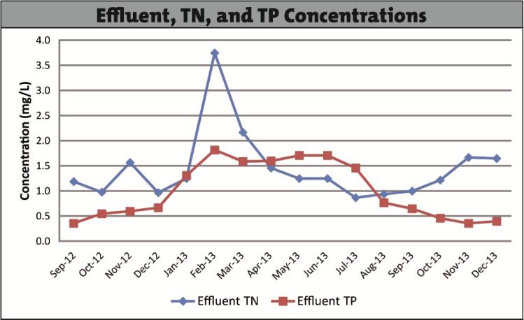 The Hybas process effectively reduced effluent nitrogen from an average of 8.64 mg/L in 2011 to 1.62 mg/L in 2013. This represented an 81% reduction in effluent TN values. The pre-IFAS baseline value for effluent total phosphorous (TP) was approximately 1.6 mg/L. After project completion and prior to commencing alum feed, the effluent values for TP were 0.46, 0.36 and 0.40 mg/L. This represented a 32% reduction in TP and exceeded the design limit of 1.0 mg/L.