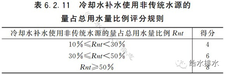 6.2.11冷卻水補水使用非傳統(tǒng)水源,評價總分值為8分,根據(jù)冷卻水補水使用非傳統(tǒng)水源的量占總用水量的比例按表6.2.11的規(guī)則評分。