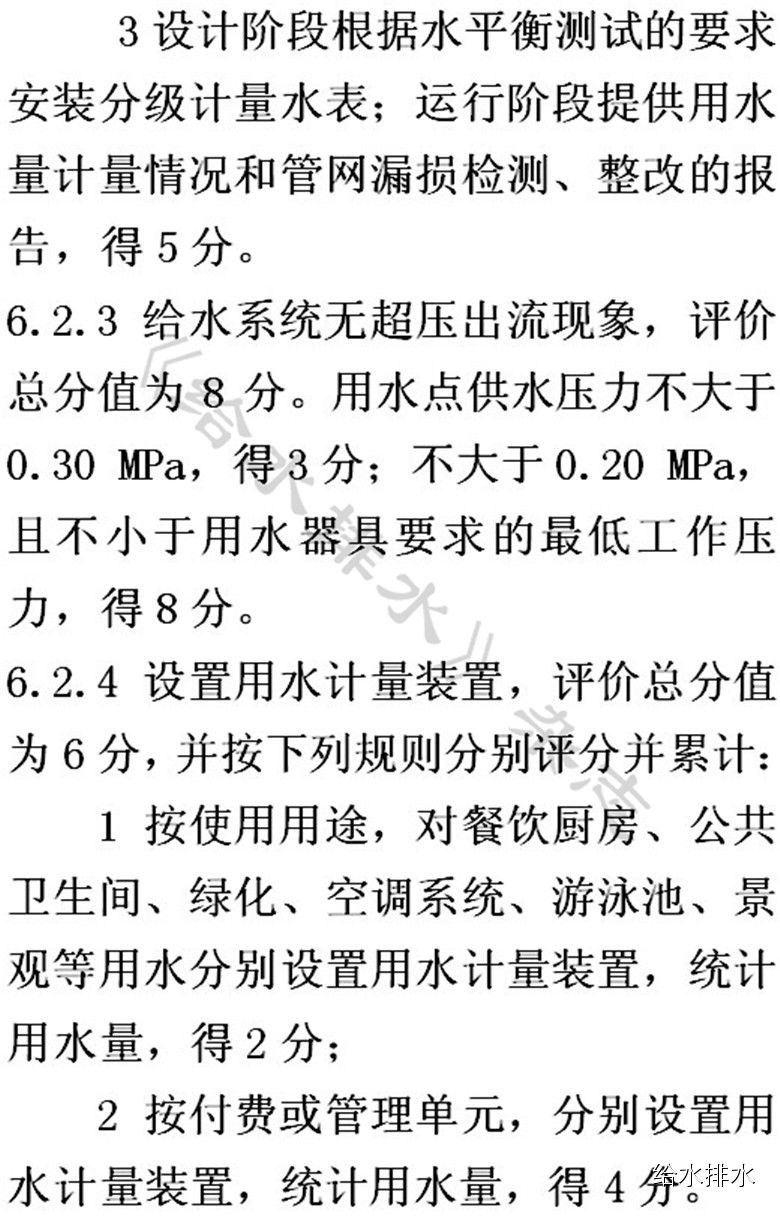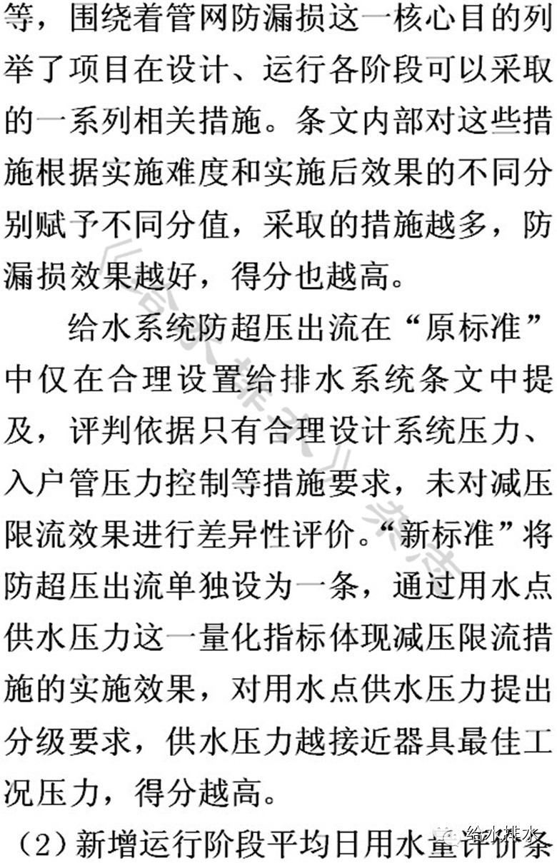 (2)將部分可細(xì)化實施措施或設(shè)置量化指標(biāo)要求的內(nèi)容放入評分項。“原標(biāo)準(zhǔn)”中的管網(wǎng)防漏損措施、防超壓出流措施要求都是作為控制項內(nèi)容存在的,對這兩方面僅作出了基本要求,無法體現(xiàn)出不同措施、不同實施效果的差異性,不利于技術(shù)的選擇和落實。“新標(biāo)準(zhǔn)”將這兩項從控制項移入評分項,細(xì)化管網(wǎng)防漏損的具體措施,將防超壓出流的效果量化為指標(biāo)。根據(jù)實施難度和實施效果對不同措施、指標(biāo)賦予不同的分值,鼓勵項目在管網(wǎng)防漏損和防超壓出流方面切實取得更好的效果。