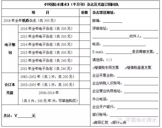 《中國(guó)給水排水》(半月刊)雜志及光盤(pán)訂閱回執(zhí)