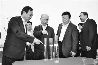 圖為山東省環(huán)保廳廳長張波(前左二)在德州市副市長翟長生(右二)、市環(huán)保局局長馬紹。ㄗ笠唬┑呐阃,現(xiàn)場查看禹城市第二污水處理廠污水處理情況。