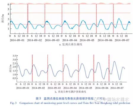 通過對201491—9日的液位監(jiān)測資料和香港尖鼻咀水文站潮汐水位(見圖3)對比,發(fā)現(xiàn)兩者的液位變化曲線形狀基本一致。91日,監(jiān)測點的最低液位為0.992 m、黃海高程為0.532 m,最高液位為2.633 m、黃海高程為2.173 m。而香港尖鼻咀的最低液位約為0.7 m,最高液位約為2.38 m,因兩個點之間存在一定的距離,潮水倒流進入雨水管道需要一定的時間,亦存在一定的水面差,但兩個點的最低和最高液位基本接近,相差約0.2 m。這反映出福田保稅區(qū)雨水管道受潮位影響較為嚴重,DN1 800的雨水管道平時充滿度皆在50%以上,一天內(nèi)約有25%以上的時間管道內(nèi)水深超過管頂標高,管道利用效率較低,暴雨時如果同時發(fā)生潮水倒灌,則極易造成管道排水不暢而引起路面積水。
