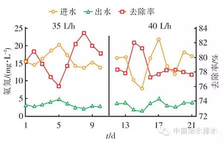從圖2可以看出,該工藝對(duì)COD的去除率較高,雖然進(jìn)水COD濃度波動(dòng)較大(110~168 mg/L),但是出水水質(zhì)相對(duì)比較穩(wěn)定。當(dāng)進(jìn)水流量為35 L/h時(shí),出水COD基本穩(wěn)定在50~60 mg/L;當(dāng)進(jìn)水流量為40 L/h時(shí),出水COD濃度則略高于60 mg/L,這說明較高的水力負(fù)荷影響了出水水質(zhì)。