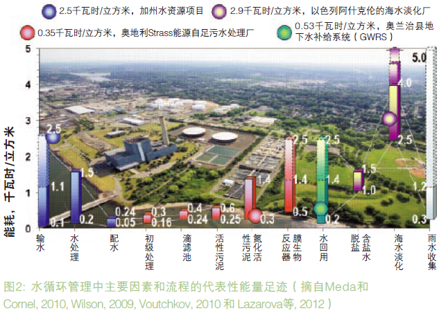 最低標(biāo)準(zhǔn)(或可接受水平)的水傳輸和水處理技術(shù)所需的能源為0.055千瓦時/立方米,數(shù)值的大小取決于水源種類(淡水、海水還是污水)和特定的地域參數(shù),如氣候、供水狀況、用水量和人口密度。圖2顯示了城市水循環(huán)與處理過程中,各主要因素在不同地區(qū)的單位能耗。水和污水處理設(shè)施所消耗的能量大致在0.2千瓦時/立方米到1.41.5千瓦時/立方米的范圍內(nèi)波動,其具體值取決于取水揚程、水處理工藝流程和處理規(guī)模。輸水設(shè)施所消耗的能量可達(dá)1.1千瓦時/立方米,并且在一些特殊情形下,如長距離運輸,可能消耗更多的能量,“加州水資源項目”就是一個典型范例,耗能達(dá)2.5千瓦時/立方米。