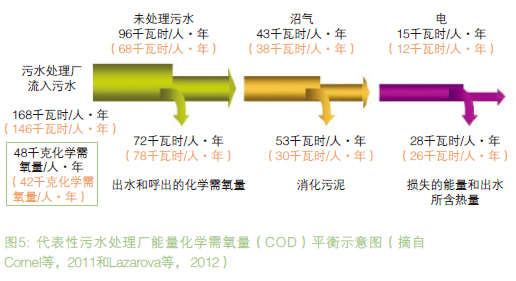 5通過兩個范例闡述能量平衡現(xiàn)象。兩個例子的共同點是均有相同的處理過程,包括初沉池、硝化作用/反硝化作用,污泥厭氧消化和沼氣利用。得出的主要結(jié)論為:每人每年承載的化學(xué)需氧量(COD)分別為48公斤和42公斤,甲烷產(chǎn)出0.35LCH4/gCOD,潛在的沼氣能含量為10千瓦時/ 立方米。在Strass例子中污水集中程度稍高,除此之外,二者的能量平衡狀況非常相似:57%96Wh/cap.year)的能量流入了污泥消化工藝,而只有26%43kWh/cap.yr)的能量轉(zhuǎn)化成了甲烷。同是32%的換能效率,只有8.9%的化學(xué)能以電能形式回收(15 k W h /cap.yr)。