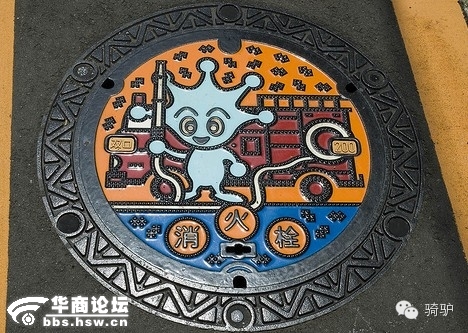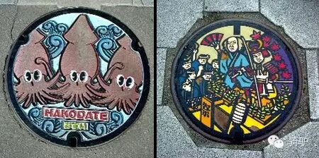 北海道函館市盛產墨魚,井蓋上就是三只跳舞的墨魚娃娃。飯?zhí)锸惺a蘋果,井蓋上3個紅艷艷的大蘋果,中間蓋上飯?zhí)锸械氖谢,讓人一目了然?/span>