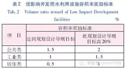 考慮到低影響開(kāi)發(fā)雨水綜合利用設(shè)施的成本增量約占項(xiàng)目總成本的2%以內(nèi),建議給予不同類(lèi)型、不同程度的同步建設(shè)低影響開(kāi)發(fā)雨水綜合利用設(shè)施的社會(huì)投資建設(shè)項(xiàng)目容積率獎(jiǎng)勵(lì),最高不超過(guò)1 000 m2建筑面積。具體如表2所示。