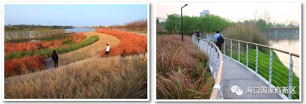 燕尾洲公園結(jié)合鄉(xiāng)土植被和地形,將河岸改造為不同重現(xiàn)期洪水可淹沒的梯田種植帶,構(gòu)建與洪水重現(xiàn)期相適應(yīng)的彈性生態(tài)防洪堤;場地內(nèi)部也采用百分之百的可下滲覆蓋,包括大面積的沙粒鋪裝作為人流的活動(dòng)場所,與種植結(jié)合的泡狀雨水收集池,和用于車輛交通的透水混泥土道路鋪裝和生態(tài)停車場,實(shí)現(xiàn)了全場地范圍內(nèi)的水彈性設(shè)計(jì)。這種以“與洪水為友”的理念為指導(dǎo),將防洪與生態(tài)保育、游憩功能很好地結(jié)合在一起。
