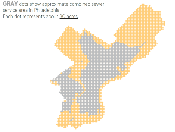 圖 費城城市面積(黃),雨污合流面積(灰),雨污合流面積中不透水面積(黑),以及綠城清水計劃將進行”綠畝” 改造的面積示意 (每個點代表30英畝)