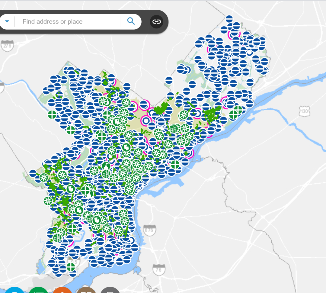 圖:最新費城的綠色基礎設施分布和數(shù)據庫 (兩個小圖分別為2014年和2016年的統(tǒng)計作為對比)