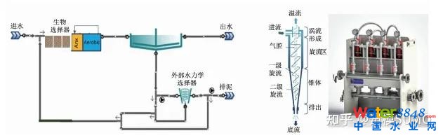 基于間歇流AGS工藝的一些不足,近些年來,連續(xù)流污泥顆;に嚰翱刂坪蛯崿F手段相關研究與應用得到重視,尤其是近五年來,基于連續(xù)流工藝的致密活性污泥(Densified Activated Sludge, DAS)工藝在美國多個項目進行大規(guī)模生產性試驗研究并得到示范應用,證明了連續(xù)流AGS & DAS技術的優(yōu)越性,尤其是與高級生化過程控制系統(tǒng)的結合。連續(xù)流AGS & DAS主要技術手段是采用生化動力學生物選擇器及水力選擇器組合形式,來篩選高密度重質顆;勰。具體而言,通過基于微生物生化代謝動力學的“快食-饑餓”(feast/famine)兩段式生化反應條件控制,并采用在線(混合液線)或離線(污泥回流線)水力學分離器以篩選密度大、沉速快的顆粒污泥,輕質污泥通過水力分離器上部溢流部件以剩余污泥形式撇除系統(tǒng)之外,加裝水力旋流器后的活性污泥生化系統(tǒng),SVI可以顯著改善,提升二沉池的泥水分離效果,處理能力因而可以得到同步提升,DAS工藝原理示意見圖9。