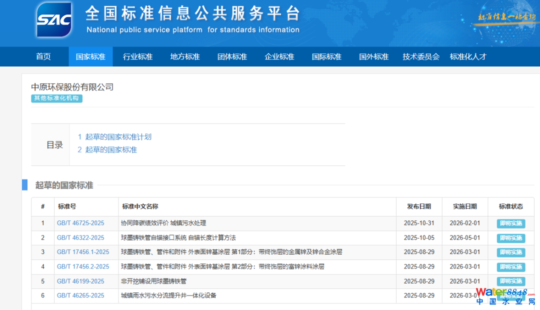 2025年以來(lái),中原環(huán)保參與編制的6項(xiàng)國(guó)家標(biāo)準(zhǔn)陸續(xù)發(fā)布,包括《城鎮(zhèn)雨水污水分流提升井一體化設(shè)備》(GB/T 46265-2025)、《非開(kāi)挖鋪設(shè)用球墨鑄鐵管》(GB/T 46199-2025)、《球墨鑄鐵管自錨接口系統(tǒng) 自錨長(zhǎng)度計(jì)算方法》(GB/T 46322-2025)、《球墨鑄鐵管、管件和附件外表面鋅基涂層 第1部分:帶終飾層的金屬鋅及鋅合金涂層》(GB/T 17456.1-2025)、《球墨鑄鐵管、管件和附件外表面鋅基涂層 第2部分:帶終飾層的富鋅涂料涂層》(GB/T 17456.2-2025)。以上標(biāo)準(zhǔn)分別由全國(guó)城鎮(zhèn)給水排水標(biāo)準(zhǔn)化技術(shù)委員會(huì)、全國(guó)鋼標(biāo)準(zhǔn)化技術(shù)委員會(huì)歸口管理,為城鎮(zhèn)排水系統(tǒng)的優(yōu)化升級(jí)提供了重要的技術(shù)支撐。